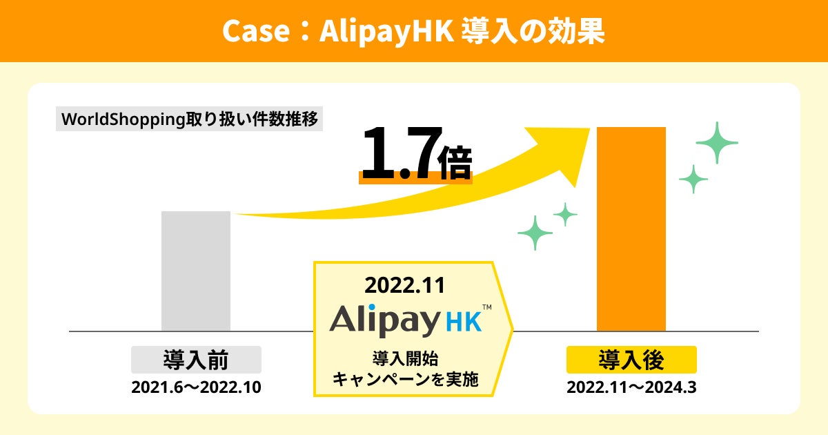 「WorldShopping」のデータを見てみると、世界中で影響力を広げるアントグループが提供する越境デジタル決済ソリューション「Alipay+」の導入に伴って、2022年11月から利用を開始した「AlipayHK(アリペイ 香港)」では、導入後の決済金額は堅調に推移し、オーダー件数の伸び率も1.7倍となりました。